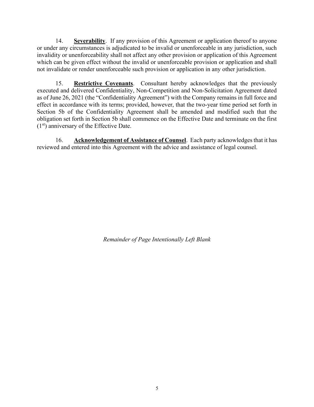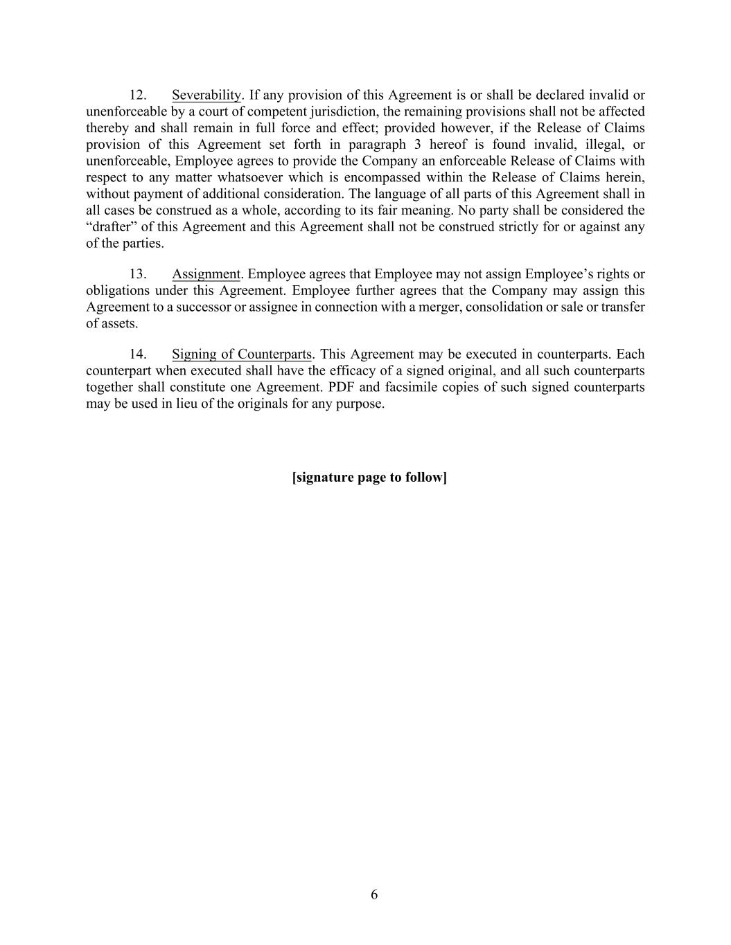 12. Severability. If any provision of this Agreement is or shall be declared invalid or unenforceable by a court of competent jurisdiction, the remaining provisions shall not be affected thereby and shall remain in full force and effect; provided however, if the Release of Claims provision of this Agreement set forth in paragraph 3 hereof is found invalid, illegal, or unenforceable, Employee agrees to provide the Company an enforceable Release of Claims with respect to any matter whatsoever which is encompassed within the Release of Claims herein, without payment of additional consideration. The language of all parts of this Agreement shall in all cases be construed as a whole, according to its fair meaning. No party shall be considered the “drafter” of this Agreement and this Agreement shall not be construed strictly for or against any of the parties. 13. Assignment. Employee agrees that Employee may not assign Employee’s rights or obligations under this Agreement. Employee further agrees that the Company may assign this Agreement to a successor or assignee in connection with a merger, consolidation or sale or transfer of assets. 14. Signing of Counterparts. This Agreement may be executed in counterparts. Each counterpart when executed shall have the efficacy of a signed original, and all such counterparts together shall constitute one Agreement. PDF and facsimile copies of such signed counterparts may be used in lieu of the originals for any purpose. [signature page to follow] 6