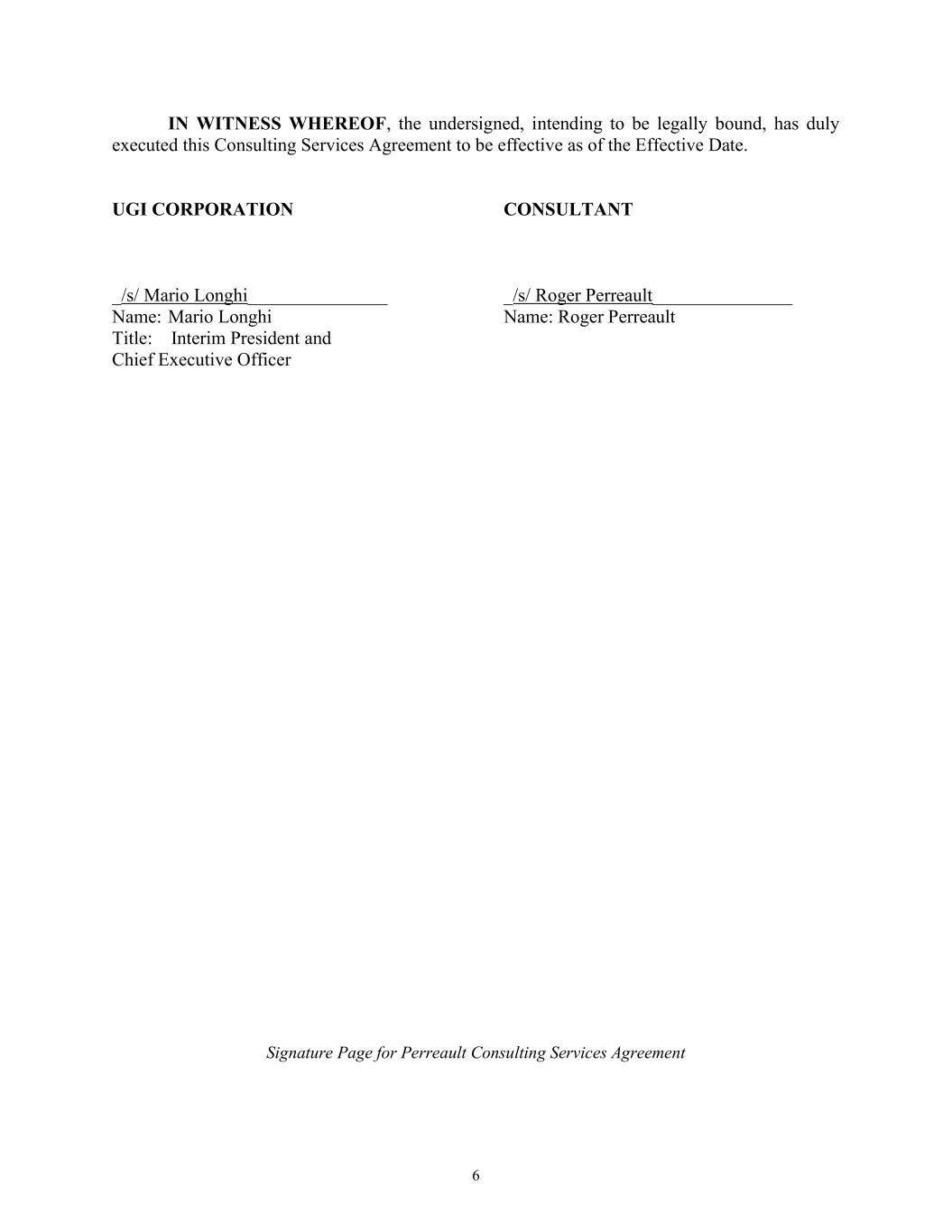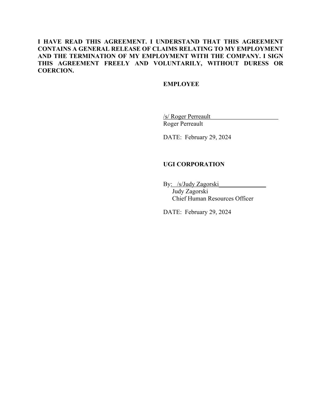 I HAVE READ THIS AGREEMENT. I UNDERSTAND THAT THIS AGREEMENT CONTAINS A GENERAL RELEASE OF CLAIMS RELATING TO MY EMPLOYMENT AND THE TERMINATION OF MY EMPLOYMENT WITH THE COMPANY. I SIGN THIS AGREEMENT FREELY AND VOLUNTARILY, WITHOUT DURESS OR COERCION. EMPLOYEE /s/ Roger Perreault Roger Perreault DATE: February 29, 2024 UGI CORPORATION By: /s/Judy Zagorski_______________ Judy Zagorski Chief Human Resources Officer DATE: February 29, 2024