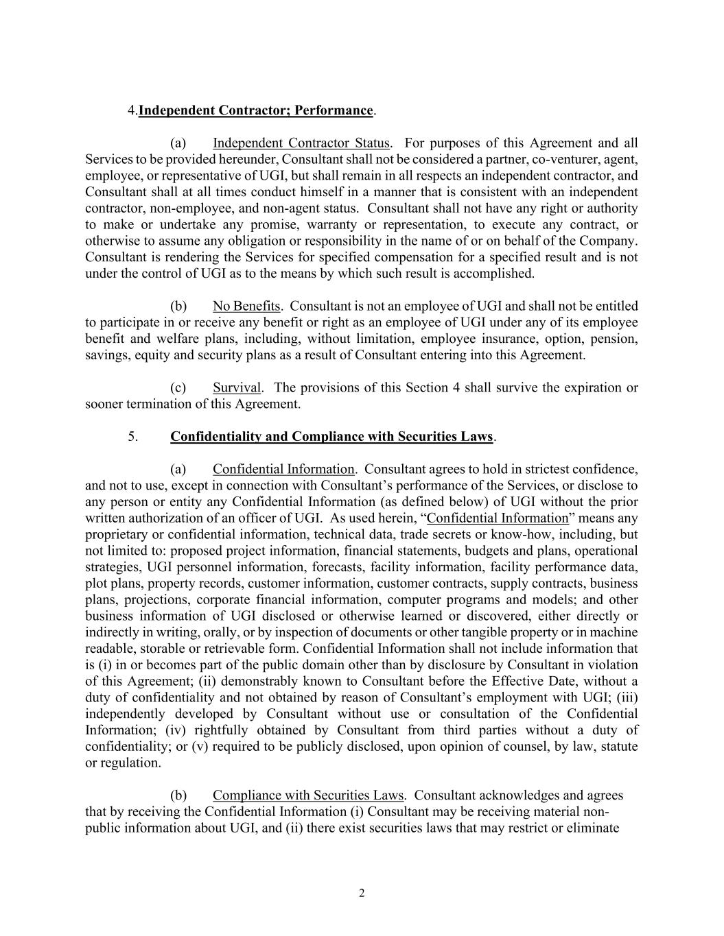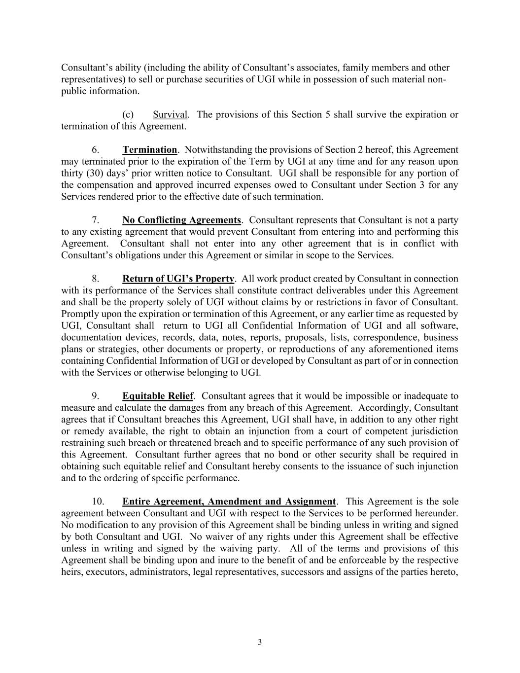 signed copy of this Agreement and any written revocation by hand delivery, mail or email to Judy Zagorski, UGI Corporation Chief Human Resources Officer, zagorskij@oneugi.com; 500 North Gulph Road, King of Prussia, PA 19406. Employee agrees with the Company that changes, whether material or immaterial, do not restart the running of the Consideration Period. 5. No Further Obligations. From and after the Separation Date, the Company and Affiliates have no obligation to provide the Employee with any payments, benefits or considerations (including, without limitation, pursuant to the Company’s Severance Plan and any Company bonus plan) other than those described herein, except for the continuation of the Employee’s medical benefits at the Employee’s own expense to the extent required by law and any vested retirement or other benefits to which the Employee is entitled under the terms of the applicable benefit plans. The Employee acknowledges and agrees that, from and after the Separation Date, except for the 2021 RSUs, all stock options, performance stock units and restricted stock units issued to the Employee under the UGI Corporation 2013 Omnibus Incentive Compensation Plan (the “2013 Plan”) and the UGI Corporation 2021 Incentive Award Plan (the “2021 Plan”) will be forfeited in accordance with the terms and conditions of the 2013 Plan, the 2021 Plan, and all applicable grant letters. The Employee further acknowledges and agrees that the Employee is releasing any claims for stock options, performance stock units, restricted stock units or rights under the 2013 Plan or the 2021 Plan, except as described herein and except for those rights vested under such plans. 6. Parties’ Relationship; Non-Disparagement. The Employee’s employment relationship with the Company and Affiliates will be permanently and irrevocably terminated as of the Separation Date, and the Company and Affiliates do not have any obligation to re-employ the Employee. From the date of this Agreement through the Separation Date, the Employee will assist the Company and Affiliates to conclude any matters that are pending and shall continue to provide such assistance after the Separation Date provided such assistance does not interfere with any subsequent employment obtained by the Employee. The Employee agrees that the Employee will not disparage or make negative references, either orally or in writing, about the Company and Affiliates or any officer, director, agent or employee of the Company and Affiliates or its or their policies, procedures, programs or business practices. Nothing in this provision shall limit the Employee’s ability to provide accurate and factual information concerning the Employee’s termination of employment. 7. No Admissions. Nothing contained in this Agreement shall be considered to be an admission by the Company and Affiliates of any violation of any federal, state or local law or of any duty owed by the Company and Affiliates to the Employee. 8. Return of Property. In further consideration of the payments made hereunder, the Employee also represents that the Employee has returned all Company-issued equipment, vehicles, records and confidential information to the Company. To the extent the Employee has any Company equipment, records or confidential information stored on a non-Company device (e.g., personal computer, tablet, USB drive, cell phone, Cloud storage, etc.), the Employee represents that (a) if the information is subject to an active Company legal hold, the Employee will contact the Company’s General Counsel as soon as practicable so that the information may be collected for preservation purposes, and (b) if the information is not subject to any active Company legal 4