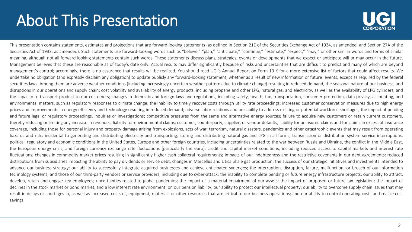 1 1 Second Quarter Fiscal 2024 Results & Business Update 1 Ma r i o L o n g h i Interim President and CEO, UGI Corporation S e a n O ’ B r i e n Chief Financial Officer, UGI Corporation Ro b e r t F. B e a rd Chief Operations Officer, UGI Corporation