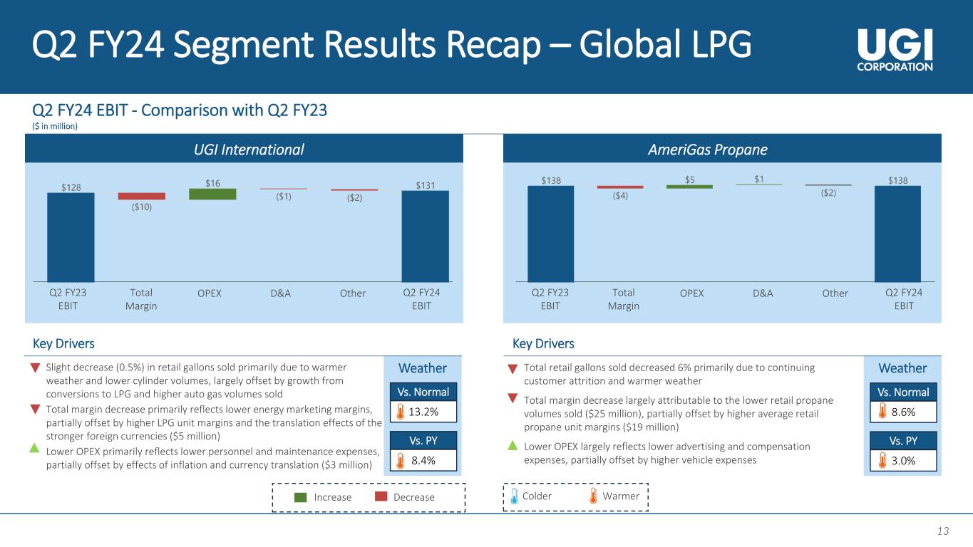 12 12 Weather Q2 FY23 EBIT Q2 FY24 EBIT Total Margin OPEX D&A Other Total margin represents total revenue less total cost of sales. In the case of Utilities, the total margin is also reduced by certain revenue-related taxes. OPEX stands for Operating & Administrative Expenses, and D&A stands for Depreciation and Amortization. DSIC stands for Distribution System Improvement Charge. Q2 FY24 Segment Results Recap – Natural Gas Q2 FY24 EBIT - Comparison with Q2 FY23 ($ in million) Utilities Key Drivers • Total margin growth primarily due to increases in base rates for PA Gas Utility (effective October 1, 2023) and Mountaineer (effective January 1, 2024), increases in DSIC revenue, and the effect of growth in the core market customers • Higher depreciation expense reflects the effects of continued distribution system capital expenditure activity 16.4% 4.7% Vs. Normal Vs. PY Increase Decrease WarmerColder Weather Midstream & Marketing Key Drivers • Total margin primarily reflects higher margin from natural gas marketing activities ($46 million), largely due to increased capacity management margin attributable to higher capacity values and the absence of unfavorable timing from storage hedges realized in the prior year, as well as favorable peaking activities • Lower OPEX primarily reflects lower salary and benefits, and maintenance expenses 13.4% 3.4% Vs. Normal Vs. PY Q2 FY23 EBIT Q2 FY24 EBIT Total Margin OPEX D&A Other