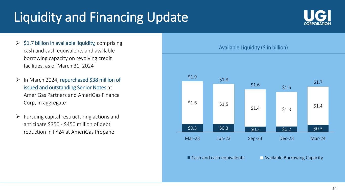 13 13 Weather• Slight decrease (0.5%) in retail gallons sold primarily due to warmer weather and lower cylinder volumes, largely offset by growth from conversions to LPG and higher auto gas volumes sold • Total margin decrease primarily reflects lower energy marketing margins, partially offset by higher LPG unit margins and the translation effects of the stronger foreign currencies ($5 million) • Lower OPEX primarily reflects lower personnel and maintenance expenses, partially offset by effects of inflation and currency translation ($3 million) Q2 FY24 Segment Results Recap – Global LPG UGI International Key Drivers 13.2% 8.4% Vs. Normal Vs. PY Increase Decrease WarmerColder Weather• Total retail gallons sold decreased 6% primarily due to continuing customer attrition and warmer weather • Total margin decrease largely attributable to the lower retail propane volumes sold ($25 million), partially offset by higher average retail propane unit margins ($19 million) • Lower OPEX largely reflects lower advertising and compensation expenses, partially offset by higher vehicle expenses AmeriGas Propane Key Drivers 8.6% 3.0% Vs. Normal Vs. PY Q2 FY24 EBIT - Comparison with Q2 FY23 ($ in million) Q2 FY23 EBIT Q2 FY24 EBIT Total Margin OPEX D&A OtherQ2 FY23 EBIT Q2 FY24 EBIT Total Margin OPEX D&A Other