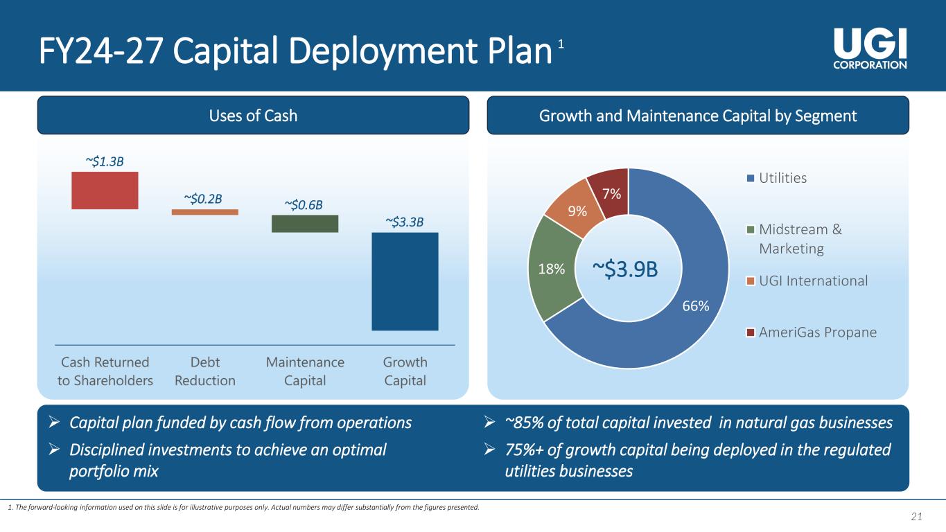17 17 FY24 - 27 Financial Targets 17 1. The forward-looking information used on this slide is for illustrative purposes only. Actual numbers may differ substantially from the figures presented. 2. Because we are unable to predict certain potentially material items affecting diluted earnings per share on a GAAP basis, principally mark-to-market gains and losses on commodity and certain foreign currency derivative instruments, we cannot reconcile fiscal year 2024 adjusted diluted EPS, a non-GAAP measure, to diluted earnings per share, the most directly comparable GAAP measure, in reliance on the “unreasonable efforts” exception set forth in SEC rules. 3. Defined as net debt to Adjusted EBITDA. Adjusted EBITDA is a non-GAAP measure. Executing on our strategy to deliver sustainable shareholder value UGI Corporation reaffirms its FY24 adjusted diluted EPS guidance range of $2.70 - $3.002 4 – 6% $3.7 - $4.1B 9%+ 3.5 – 4.0x EPS Growth Rate Capital Expenditure Rate Base Growth Rate Leverage Ratio3 1