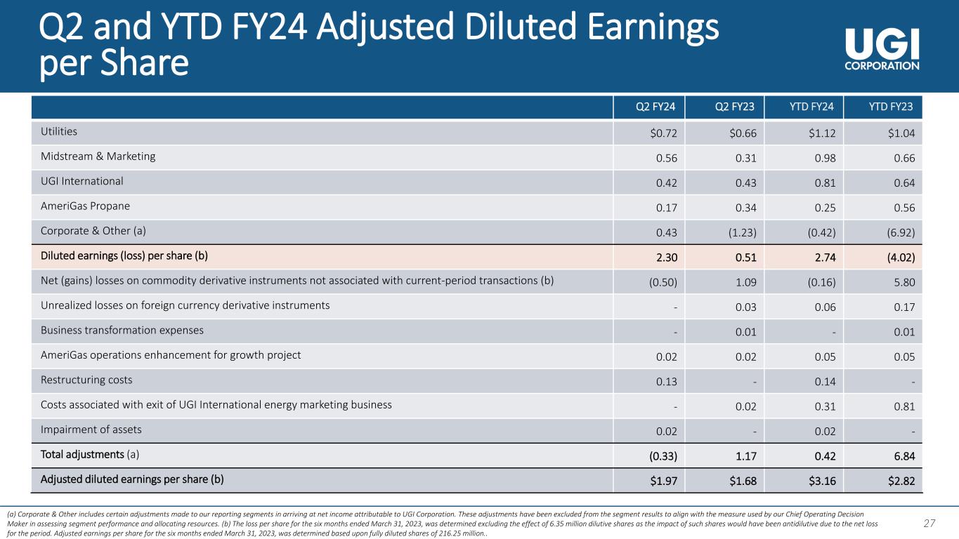 27 27 Q2 and YTD FY24 Adjusted Diluted Earnings per Share (a) Corporate & Other includes certain adjustments made to our reporting segments in arriving at net income attributable to UGI Corporation. These adjustments have been excluded from the segment results to align with the measure used by our Chief Operating Decision Maker in assessing segment performance and allocating resources. (b) The loss per share for the six months ended March 31, 2023, was determined excluding the effect of 6.35 million dilutive shares as the impact of such shares would have been antidilutive due to the net loss for the period. Adjusted earnings per share for the six months ended March 31, 2023, was determined based upon fully diluted shares of 216.25 million.. Q2 FY24 Q2 FY23 YTD FY24 YTD FY23 Utilities $0.72 $0.66 $1.12 $1.04 Midstream & Marketing 0.56 0.31 0.98 0.66 UGI International 0.42 0.43 0.81 0.64 AmeriGas Propane 0.17 0.34 0.25 0.56 Corporate & Other (a) 0.43 (1.23) (0.42) (6.92) Diluted earnings (loss) per share (b) 2.30 0.51 2.74 (4.02) Net (gains) losses on commodity derivative instruments not associated with current-period transactions (b) (0.50) 1.09 (0.16) 5.80 Unrealized losses on foreign currency derivative instruments - 0.03 0.06 0.17 Business transformation expenses - 0.01 - 0.01 AmeriGas operations enhancement for growth project 0.02 0.02 0.05 0.05 Restructuring costs 0.13 - 0.14 - Costs associated with exit of UGI International energy marketing business - 0.02 0.31 0.81 Impairment of assets 0.02 - 0.02 - Total adjustments (a) (0.33) 1.17 0.42 6.84 Adjusted diluted earnings per share (b) $1.97 $1.68 $3.16 $2.82