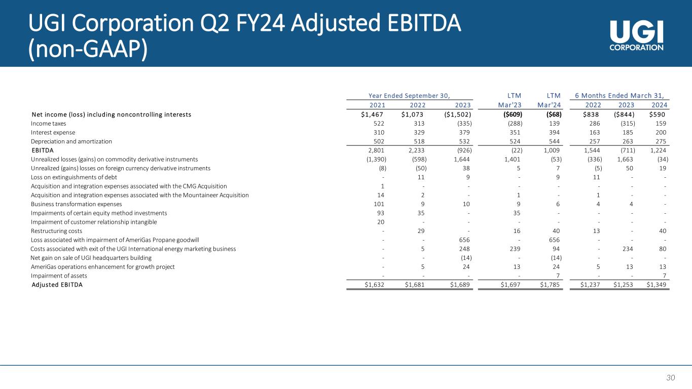 29 29 Q2 FY24 Segment Reconciliation (GAAP) ($ in Million) 1. For US GAAP purposes, certain revenue-related taxes within our Utilities segment are included in “Operating and administrative expenses” above. Such costs reduce margin for Management’s Results of Operations reported in our periodic filings. 1 1 All non-GAAP adjustments are recorded at Corporate and Other. As a result, GAAP and non-GAAP earnings from each reportable segment – Utilities, Midstream & Marketing, UGI International and AmeriGas Propane – are the same. Total Uti l i ties Midstream & Marketing UGI International AmeriGas Propane Corp & Other Revenues $2,467 $646 $483 $673 $795 ($130) Cost of sales (1,030) (274) (283) (368) (362) 257 Total margin 1,437 372 200 305 433 127 Operating and administrative expenses (591) (106) (29) (155) (258) (43) Depreciation and amortization (138) (41) (22) (29) (44) (2) Other operating income (expense), net 9 0 2 3 7 (3) Operating income (loss) 717 225 151 124 138 79 Income (loss) from equity investees 1 0 2 (1) 0 0 Other non-operating (expense) income, net 11 1 0 8 0 2 Earnings (loss) before income taxes and interest expense 729 226 153 131 138 81 Interest expense (100) (24) (9) (11) (40) (16) Income (loss) before income taxes 629 202 144 120 98 65 Income tax (expense) benefit (133) (47) (24) (29) (61) 28 Net income (loss) income attr ibutable to UGI Corporation $496 $155 $120 $91 $37 $93